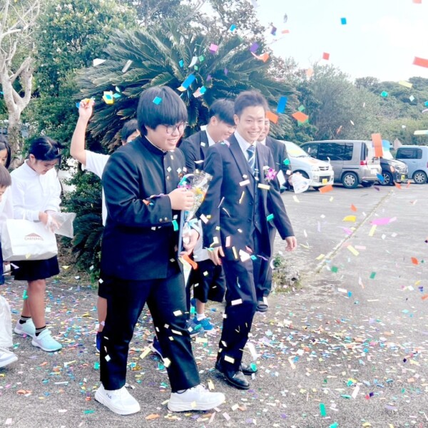 久松中学校(下地直樹校長)の第75回卒業式は8日午前9時半から「美ら島で出逢えた奇跡の世代 輝き続ける未来へ進む片道切符」のテーマで行われた。