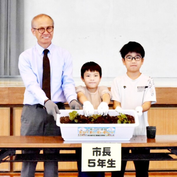 人権の花運動の植え付け式が19日、西城小学校で行われ、全校児童が参加した。