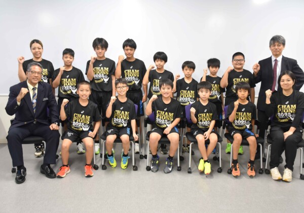 りゅうぎんカップ「第48回県小学生バレーボール大会」で優勝した結の橋クラブの選手らが19日に市役所を訪れ、宮城克典教育長に報告した。