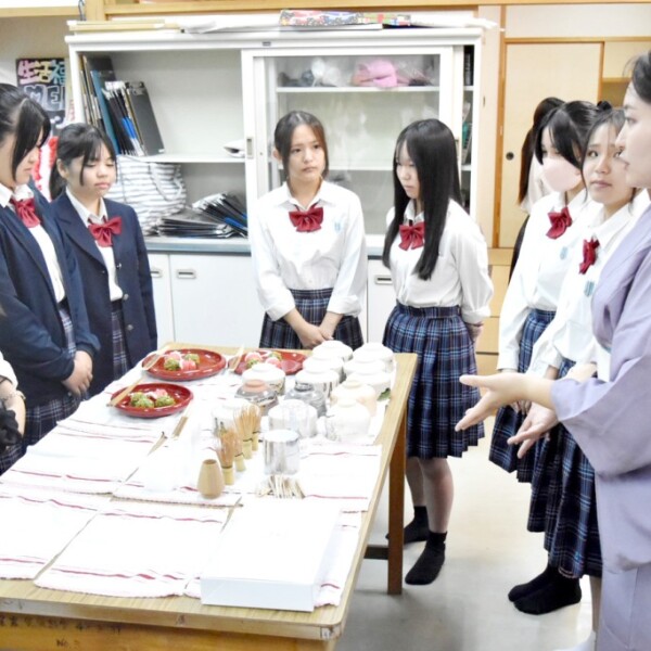 宮古総合実業高校の生活福祉科3年生を対象とした茶道学習会が18日、同校で行われ、茶道裏千家専任講師の佐藤志穗さんと下地静華さんが講師をつとめた。