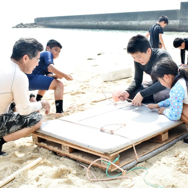 県立宮古青少年の家 (島尻政俊所長) の 「大野山林にきたえる少年の集い」 3日目の10日、 高野漁港隣の海岸でイカダづくりが行われた。