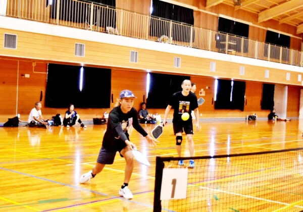 新しいスポーツとして注目される「ピックルボール」の交流大会(宮古島ピックルボール主催)が23日、航空自衛隊宮古島分屯基地内の体育館で開かれた。