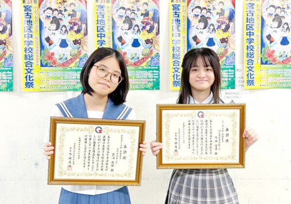 第31回宮古地区中学校総合文化祭のテーマ・ポスター表彰式が24日、働く女性の家(ゆいみなぁ)で行われ、テーマの部では伊良部島3年の下地煌菜さんが「未来へつなぐ私たちの文化のカタチ」で最優秀に輝き、ポスターの部では西辺3年の前泊碧桜さんの作品が選ばれた。