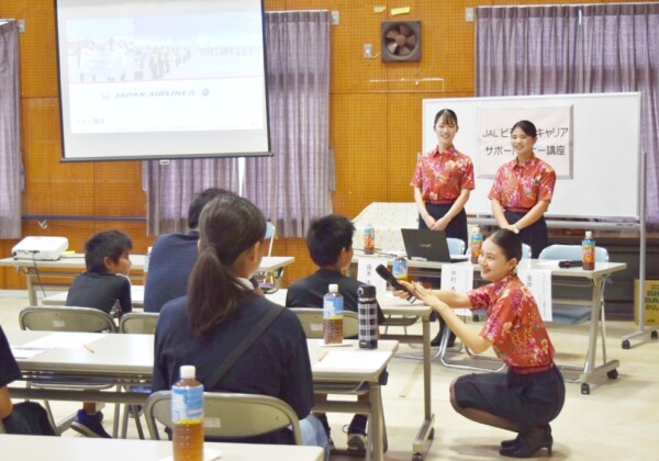 市社会福祉協議会は20日、平良老人福祉センターでJALスカイエアポート沖縄地上スタッフを講師に招いた中高生を対象にしたマナー講座「JALビジネスキャリアサポート」を開いた。