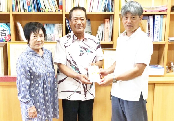 佐良浜小・中学校の昭和30年生卒業生が24日、母校となる伊良部島小中学校に寄付金を贈呈した。