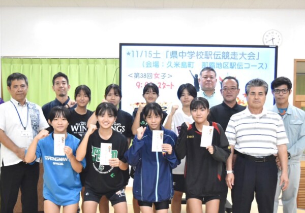 15日に始まる第38回沖縄県中学校駅伝競走大会(久米島町)に出場する城東中学校女子駅伝部へ12日、砂川学区スポーツ協会、西城学区体育協会、城辺学区体育協会、城辺地域づくり協議会の4団体の代表者が学校を訪れ、選手たちに激励の言葉をかけ寄付金を贈呈した。