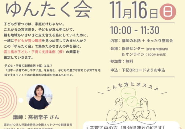 市こども家庭局子育て支援課は16日午前10時から、市保健センターで「子ども・子育てゆんたく会」を初開催する。