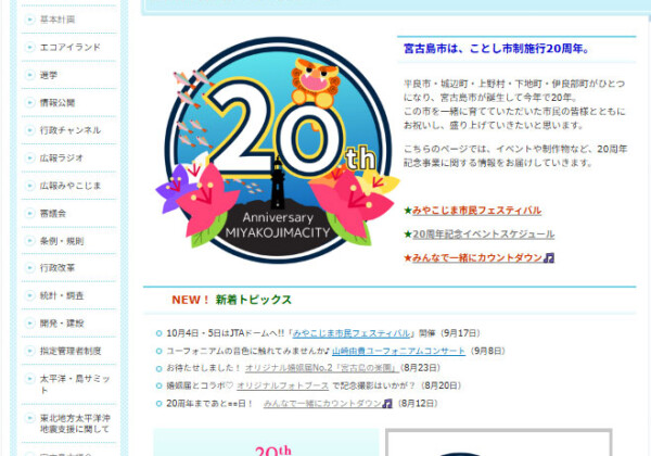 2005年に平良市、城辺町、上野村、下地町、伊良部町の5市町村が合併して誕生した宮古島市は市制施行20周年を迎える。