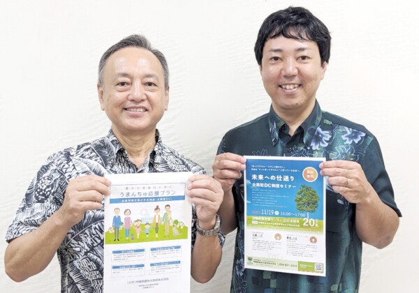 (公社)県農林水産団体共済会の又吉宗光専務理事とアドバイザーの兼島良太さんが5日、宮古新報社を訪れ、本年度から同法人が導入した「うまんちゅ応援プラン」(企業型確定拠出年金制度=企業型DC)について説明した。