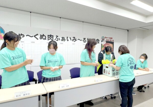 市農林水産部畜産課は6日、市役所で市制施行20周年記念事業の一環となる「みゃ~くぬ肉ふぁいみ~る抽選会」を開催した。