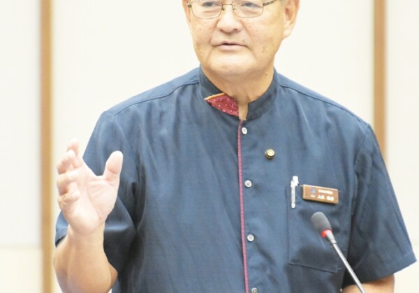 宮古島市議会9月定例会の一般質問を終えた29日、今議会限りで勇退する長崎富夫氏、上地廣敏氏、西里芳明氏、山里雅彦氏があいさつを行った。
