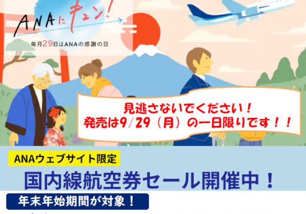 全日本空輸(ANA)の月例企画「ANAにキュン!」で、年末年始期間を対象とした特別セールがあす29日に1日限定で実施される。