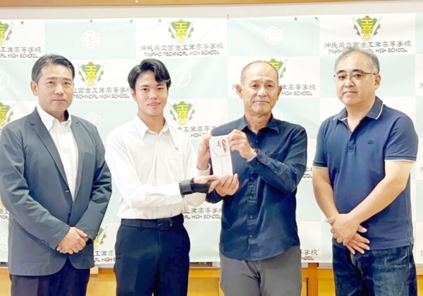宮古島自転車競技協会(下地勝男会長)は19日、全九州高等学校自転車競技新人大会の派遣費用助成として、宮古工業高校自転車競技部の友利有斗武さん(2年)へ激励金を贈呈した。