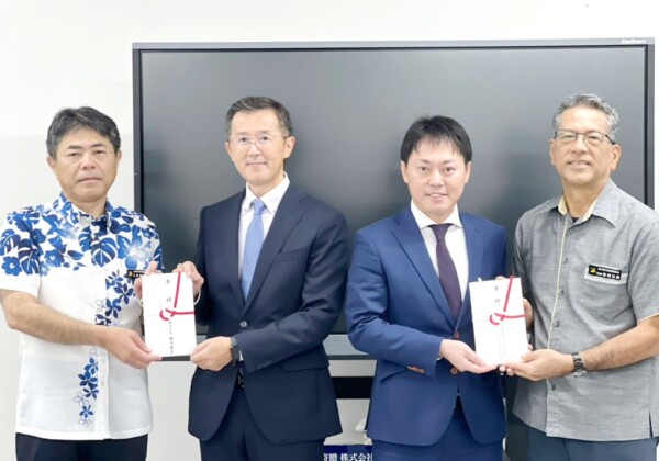 宮古島の雪塩(西里長冶代表)が運営する島の駅みやこが昨年5月から開始した「宮古島の中学校へ本を贈ろうプロジェクト」の贈呈式が18日、市役所で行われた。