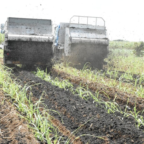 サトウキビの成長を促す 広栄開発 夏植えほ場に堆肥散布