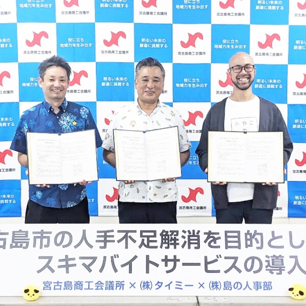 全国でスキマバイトサービスを展開するタイミー(東京都、小川嶺代表)と宮古島商工会議所(根路銘康文会頭)、島の人事部(千田泰平代表)は29日、包括連携協定を締結した。