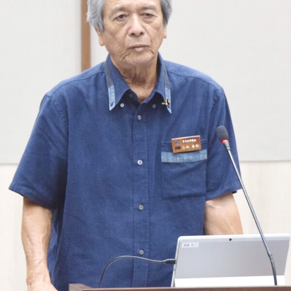 本議会での勇退を表明している上地廣敏氏はこれまで質してきた西浜崎の海浜浸食対策、戦争体験の継承、防災風土の確立、農道整備の見通しを追及した。