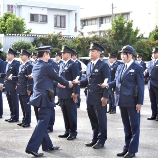 宮古島警察署で1日朝、冬服への衣替えに合わせた制服と装備品の点検が行われ、新垣健一郎署長が警察官一人ひとりの身だしなみや持ち物を細かく確認した。