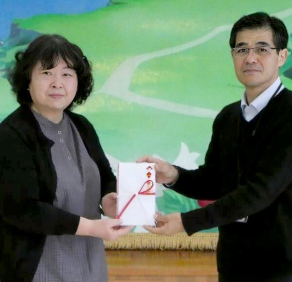 東京都在住の小日山幸子さんが22日、市城辺の市社会福祉センターを訪れ、市内の子どもたちの福祉向上に役立ててほしいとして、市社会福祉協議会(野原勝会長)へ寄付金を贈呈した。岩手県宮古市の知人から「宮古島」との交流について聞いたことが縁とのことで、今回の温かい支援へとつながった。