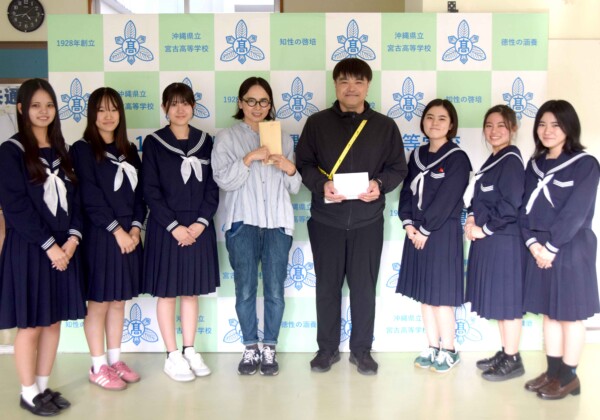 宮古高校は19日、昨年9月に開催した学園祭の飲食店収益金を、市内でこども食堂などを運営する2団体へ全額寄付した。同校事務室前で行われた贈呈式では、生徒たちが自らの手で生み出した売上を託し、宮古島の次世代を担う子どもたちの支援につなげた。