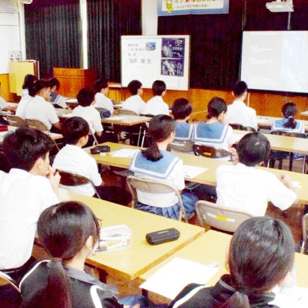 西辺中学校で11日、自然学習の一環として「八重千潮の魅力にせまる」と題した講話が行われ、講師として市生涯学習部の島田剛さんが登壇。