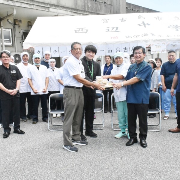 JAおきなわ宮古島支店(荷川取務支店長)は18日、漲水学園に宮古牛や豚肉、ウィンナー、宮古そば、米10㌔などのBBQセットを贈呈した。