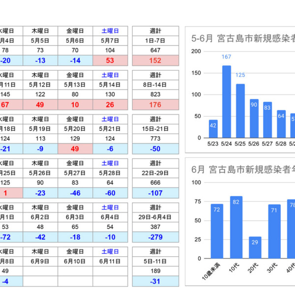 沖縄県は6日、宮古島市在住者で新型コロナ感染者19人を確認したと発表。市在住の50代男性2人の死亡を確認、市における死亡者数は...