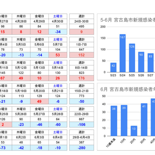 沖縄県は4日、宮古島市在住者で新型コロナ感染者54人を確認したと発表。入院療養者は1人(中等症1人)。市での直近1週間の人口1...