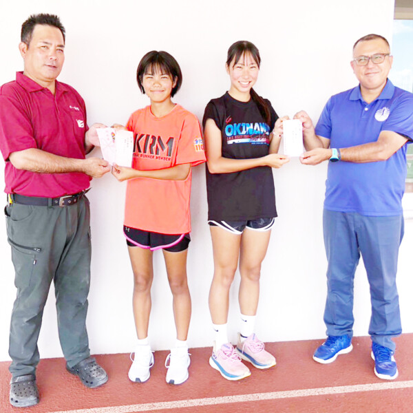 宮古長距離同好会(池間啓貴会長)は14日、上野中学校2年の渡真利彩菜さんと平良中学校2年の村山結里さんに、今後の活躍を期待して強化費を授与した。