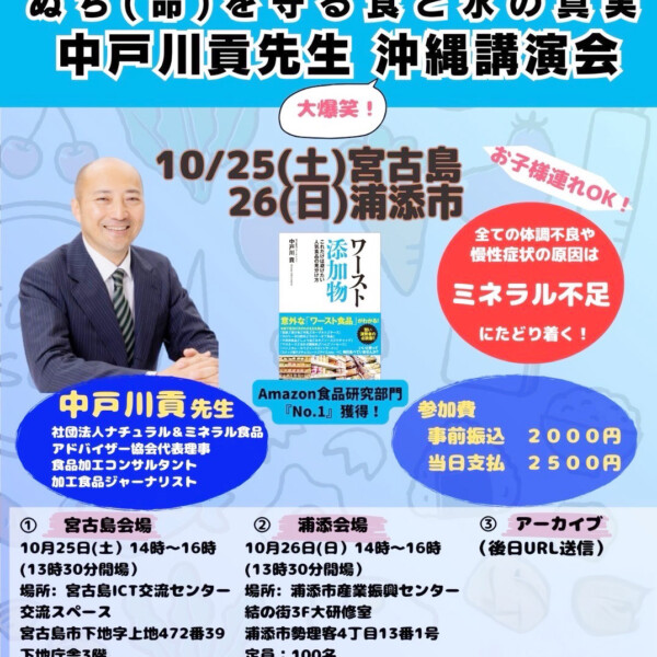 食品添加物や農薬、水質汚染など現代の食を取り巻く課題をテーマにした講演会「ぬち(命)を守る食と水の真実」と題した講演会(同講演会事務局主催)が25日、下地上地のICT交流センター(旧下地庁舎)で開催される。