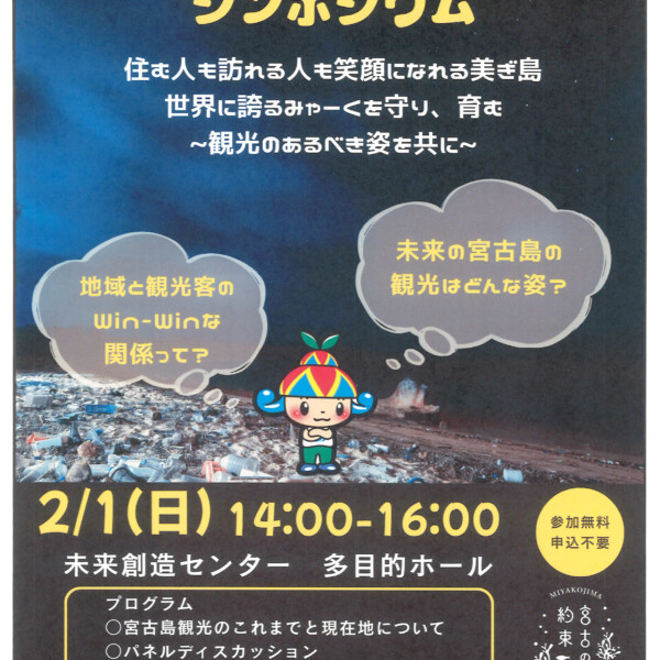 宮古島市は2月1日午後2時から市未来創造センター多目的ホールで「宮古島市観光振興ビジョンシンポジュウム」を開催する。