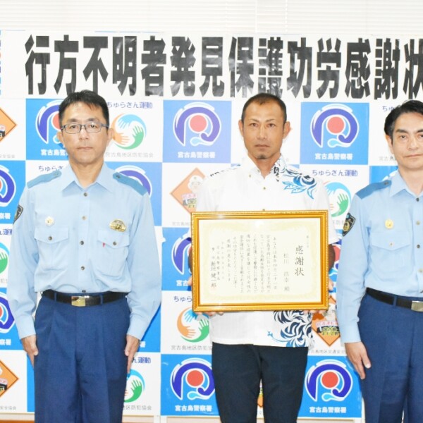 宮古島警察署(新垣健一郎署長)は7日、市内で行方不明の高齢女性(72)を発見保護した松川浩幸さん(41)に感謝状を贈った。