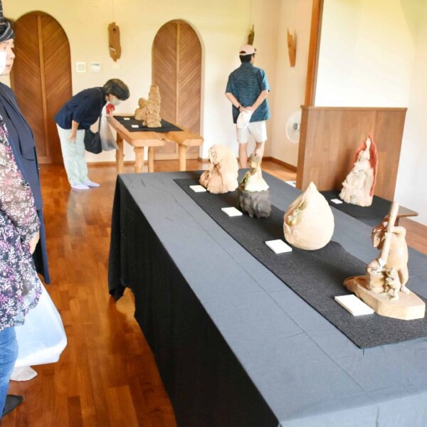 平良西原出身で北海道在住の現代木彫作家の仲間智登志さんの個展が、12日から城辺比嘉(加治道)の宿・金次郎家で始まった。