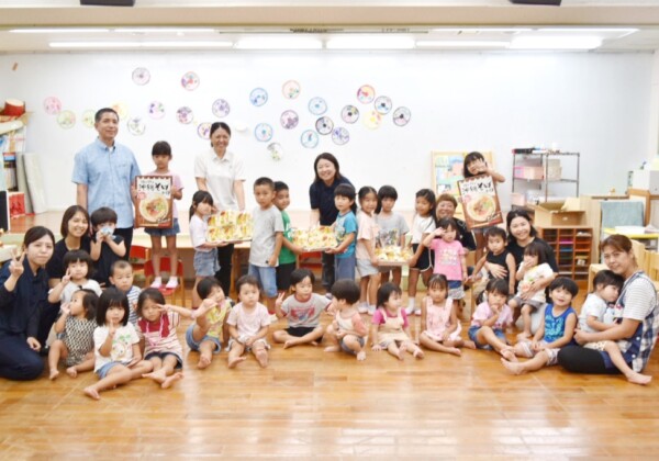 あす17日の沖縄そばの日にちなんで15日、ハワイ製麺所(安元徹好代表取締役)は佐良浜保育所(与那原千春所長)を訪れ、そば20袋(計10㌔)を贈った。