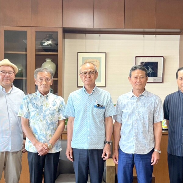 農業生産法人大嶺ファームの上地登会長、高田ファームの兼島弘美社長と楽南フルーツの洲鎌英徳代表、農業生産法人、市議会議員の我如古三雄氏は23日、市役所を訪れ、台風などの自然災害から園芸産地を守り、安定生産を目指すための沖縄型耐候性園芸施設整備事業早期導入への要請書を提出した。