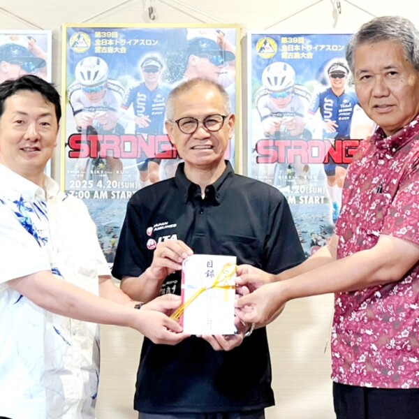 第39回全日本トライアスロン宮古島大会の成功を願い、三菱地所ホテルズ&リゾーツ社の根間靖ホテルアトールエメラルド宮古島総支配人らは14日、市役所に嘉数登市長を訪ね、寄付金を贈呈した。