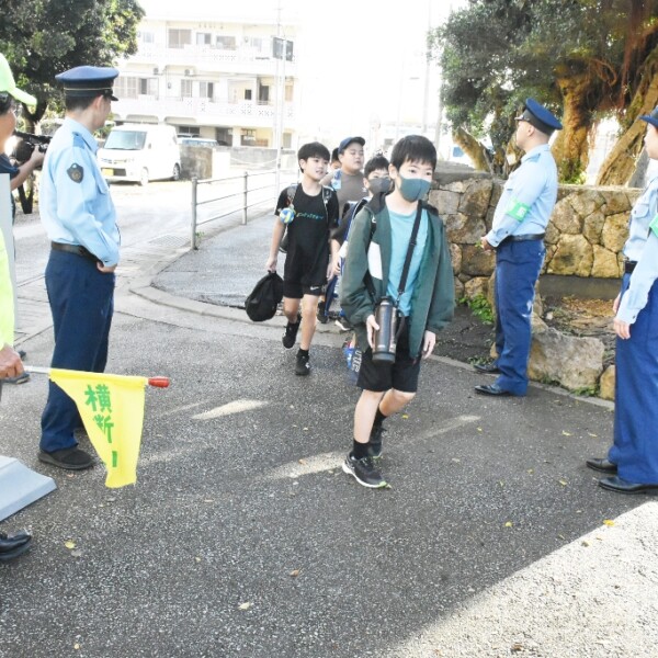 宮古島地区防犯協会(前川尚誼会長)と宮古島警察署(新垣健一郎署長)は11日、平一小学校正門前などで新学期に伴う朝のあいさつ運動を行った。