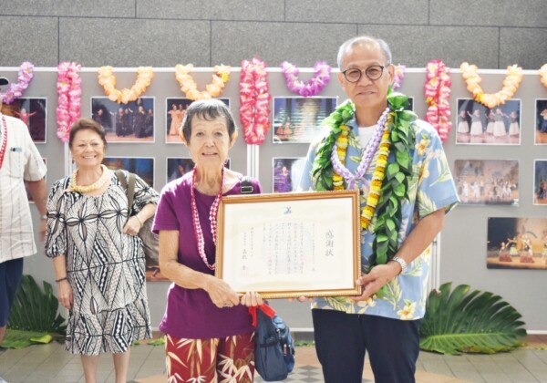 カギマナフラin宮古島2025のインターナショナルフラコンペティションに合わせて11日、マティダ市民劇場で、長年にわたり宮古島市海外ホームステイ派遣事業に尽力してきたマウイ島在住のベティー・ヤマシロさんに、嘉数登市長から感謝状が贈られた。