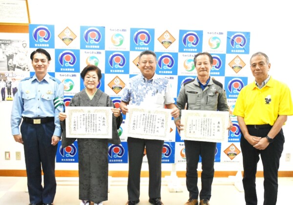 宮古島警察署で14日、多年にわたり交通安全に献身的に尽力し、交通安全の推進に多大な功績があったとして九州管区警察局長・九州交通安全協会長連名表彰の砂川富三さん、全日本交通安全協会長「交通栄誉章十字銅章」の石原雄さん、花城愛子さんに表彰状が伝達された。