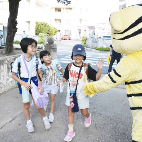 宮古島警察署と宮古地区防犯協会、防犯ボランティアが14日、東小学校正門前で2025年度全国地域安全運動に伴う朝のあいさつ運動を行った。