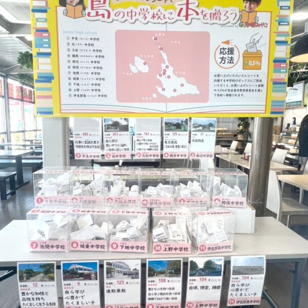 島の駅みやこでは、購入したレシートを特設ボックスに投函することで、その金額の0・5%が市内の中学校に本として寄贈されるキャンペーンを実施している。