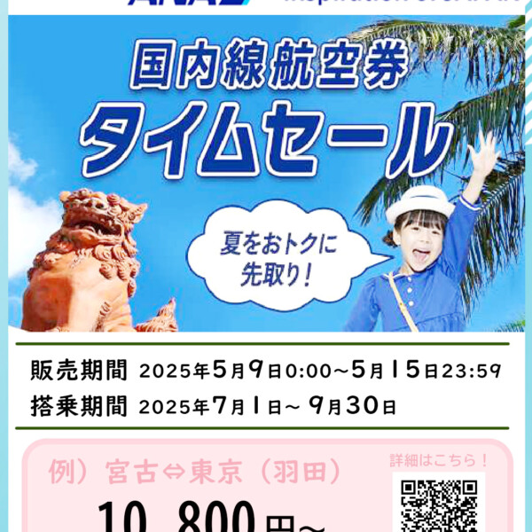 ANAは9日から「ANASUPERVALUESALE」と題した国内線航空券のタイムセールを開始した。