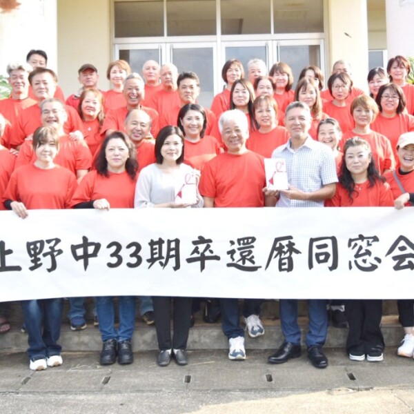 上野中学校33期生の有志40人が23日、同小中学校へ寄付金を贈呈した。前日には43人が集まり還暦祝いを開き、節目の年を迎えた仲間たちが「母校への恩返しを形にしたい」と思いを寄せた。