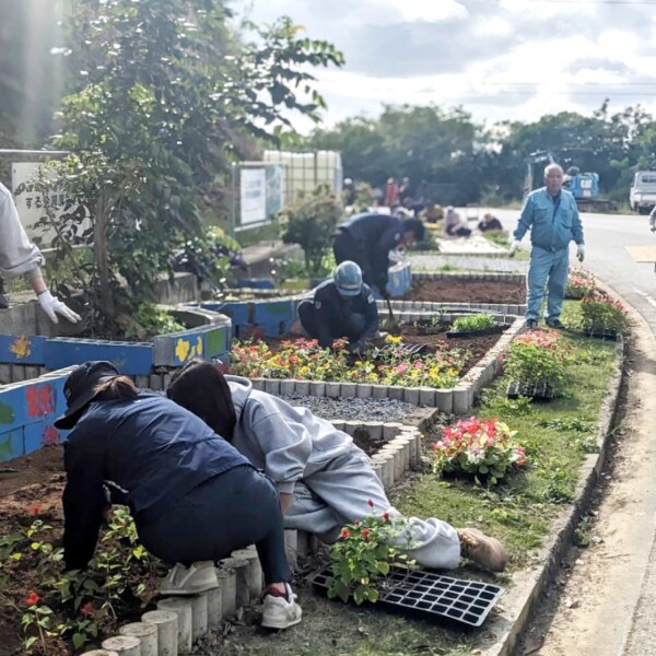 千代田開発が平良松原の海岸線道路沿いに整備した花壇に地域の任意団体らが協力して花苗の鉢上げ作業を実施し、道路沿いを彩った。