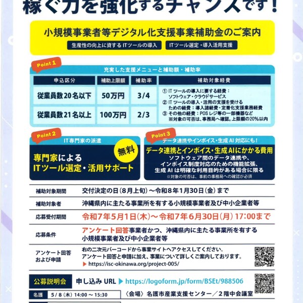 (一社)沖縄ITイノベーション戦略センター(ISCO)は県内の中小企業者および小規模事業者を対象にした県からの委託事業「小規模事業者等デジタル化支援事業」の応募を1日から開始したと発表した。