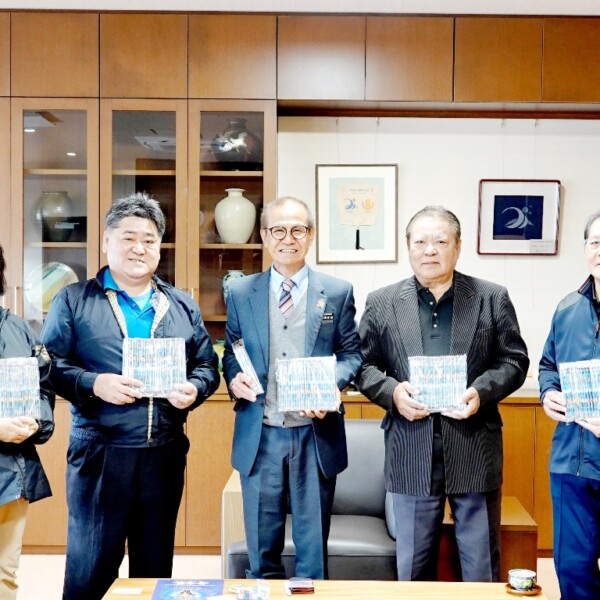 上野宮国のニチオキ宮古島(比屋根安春代表)は3日、市役所に嘉数登市長を訪ね、比屋根代表の思いを込めた「みーやえんぴつ」を寄贈した。