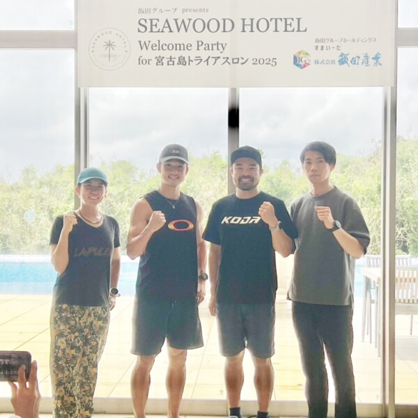 飯田グループは18日、第39回全日本トライアスロン宮古島大会「ゴールドパートナー」を記念して、大会2連覇中の寺澤光介選手を含む招待選手を招いたウェルカムパーティーを下地来間の宮古島来間シーウッドホテル内飲食店で開催した。