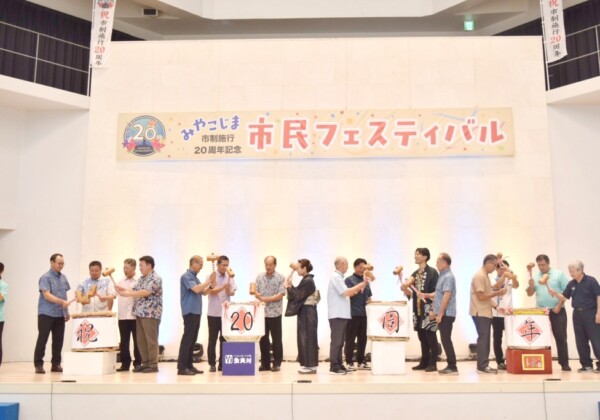 宮古島市制施行20周年記念市民フェスティバル2日目の5日、JTAドーム宮古島で「一石がめ泡盛」の樽酒鏡開きセレモニーが行われた。