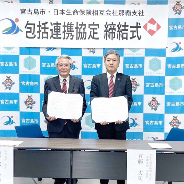 宮古島市(座喜味一幸市長)と日本生命保険相互会社那覇支社(首藤丈司支社長)は9日、市役所で包括連携締結式を行い、地域課題の解決や住民サービスの向上を目指すことを発表した。