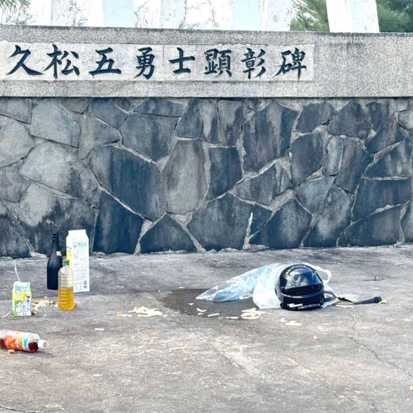 年の瀬の12月29日未明から明け方にかけ、平良久貝の久松五勇士顕彰碑で何者かが酒盛りをし、ごみがそのまま放置されていたことが分かった